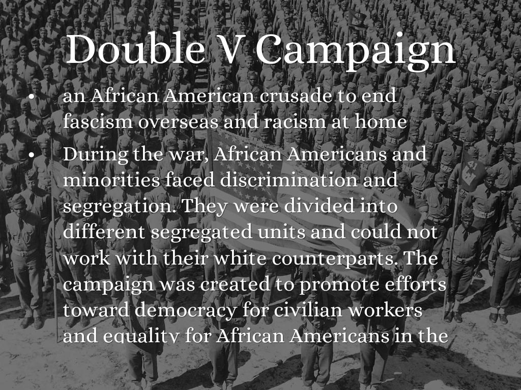 During the war, African Americans and minorities faced discrimination and segregation. They were divided into different segregated units and could not work with their white counterparts. The campaign was created to promote efforts toward democracy for civilian workers and equality for African Americans in the military.