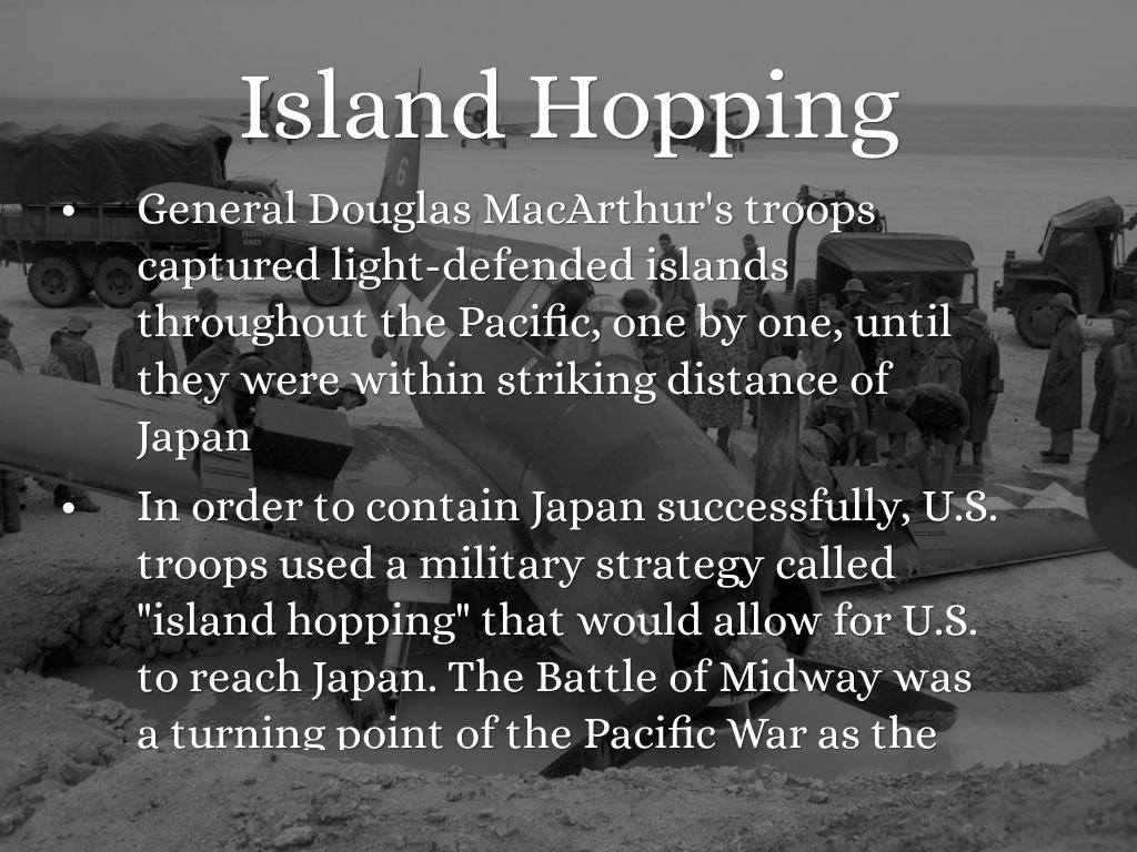 In order to contain Japan successfully, U.S. troops used a military strategy called "island hopping" that would allow for U.S. to reach Japan. The Battle of Midway was a turning point of the Pacific War as the U.S. Navy defeated Imperial Japanese Navy.