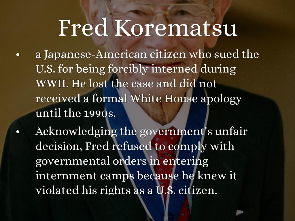 Acknowledging the government's unfair decision, Fred refused to comply with governmental orders in entering internment camps because he knew it violated his rights as a U.S. citizen.