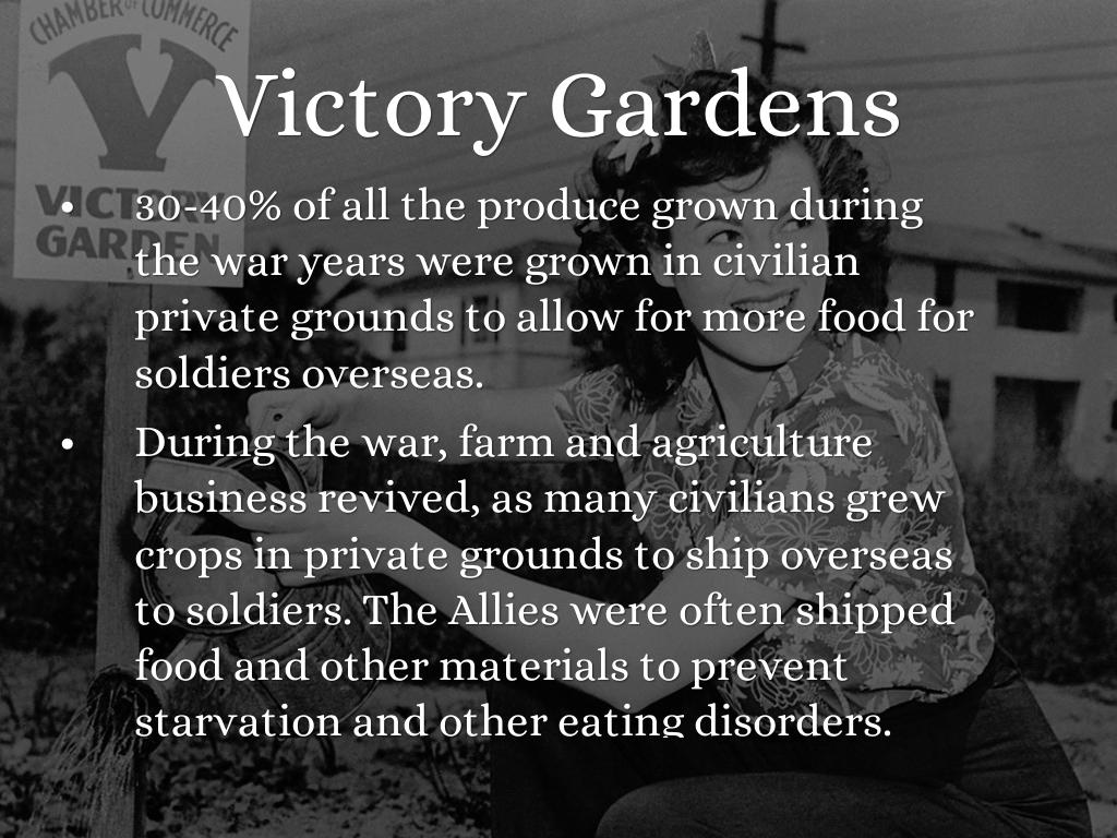 During the war, farm and agriculture business revived, as many civilians grew crops in private grounds to ship overseas to soldiers. The Allies were often shipped food and other materials to prevent starvation and other eating disorders.