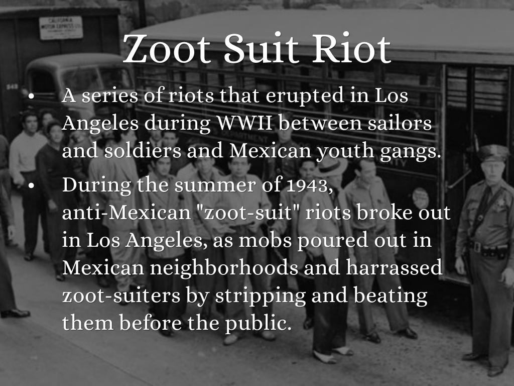 During the summer of 1943, anti-Mexican "zoot-suit" riots broke out in Los Angeles, as mobs poured out in Mexican neighborhoods and harrassed zoot-suiters by stripping and beating them before the public.