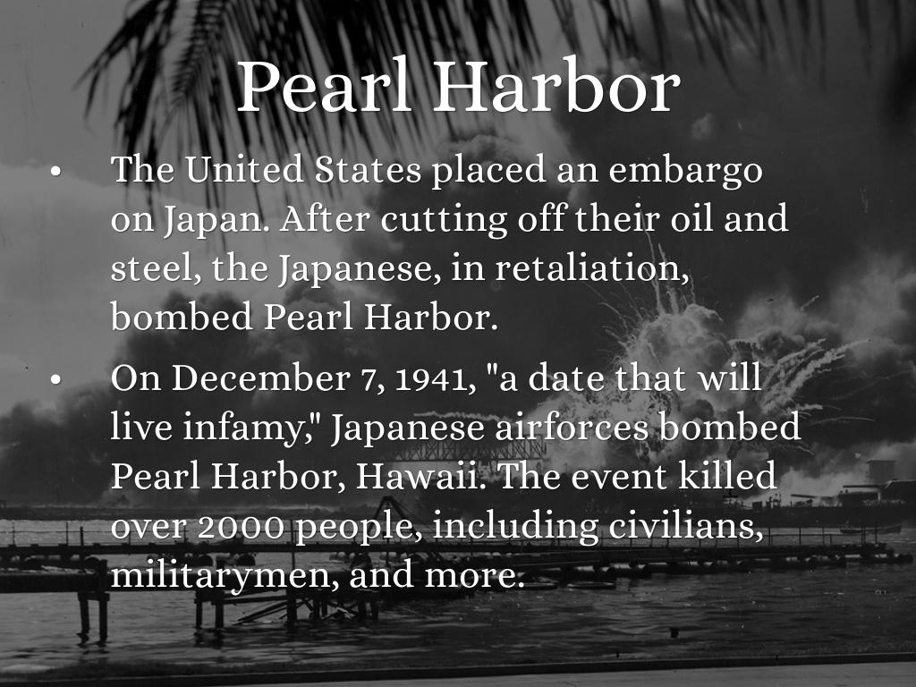 The United States placed an embargo on Japan. After cutting off their oil and steel, the Japanese, in retaliation, bombed Pearl Harbor.