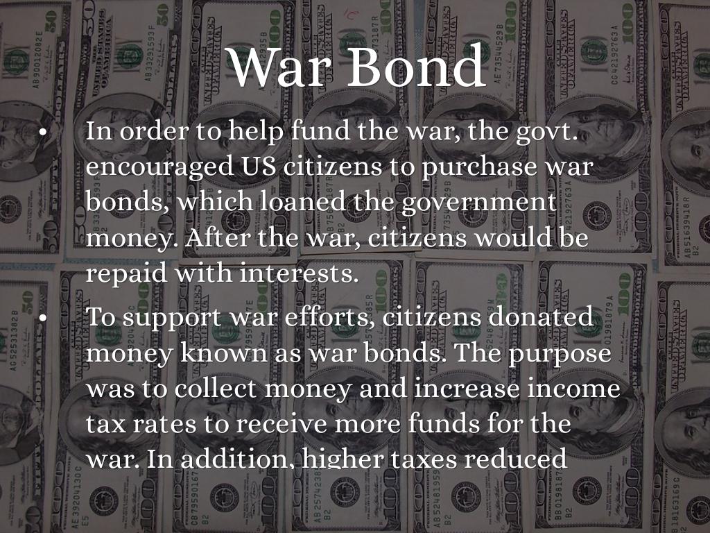 In order to help fund the war, the govt. encouraged US citizens to purchase war bonds, which loaned the government money. After the war, citizens would be repaid with interests.