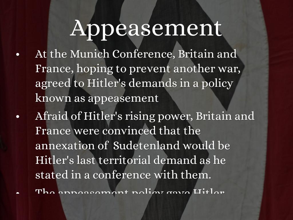 Afraid of Hitler's rising power, Britain and France were convinced that the annexation of Sudetenland would be Hitler's last territorial demand as he stated in a conference with them.