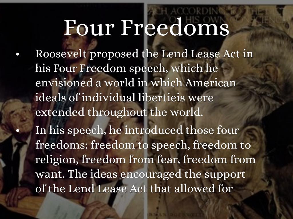 Roosevelt proposed the Lend Lease Act in his Four Freedom speech, which he envisioned a world in which American ideals of individual libertieis were extended throughout the world.