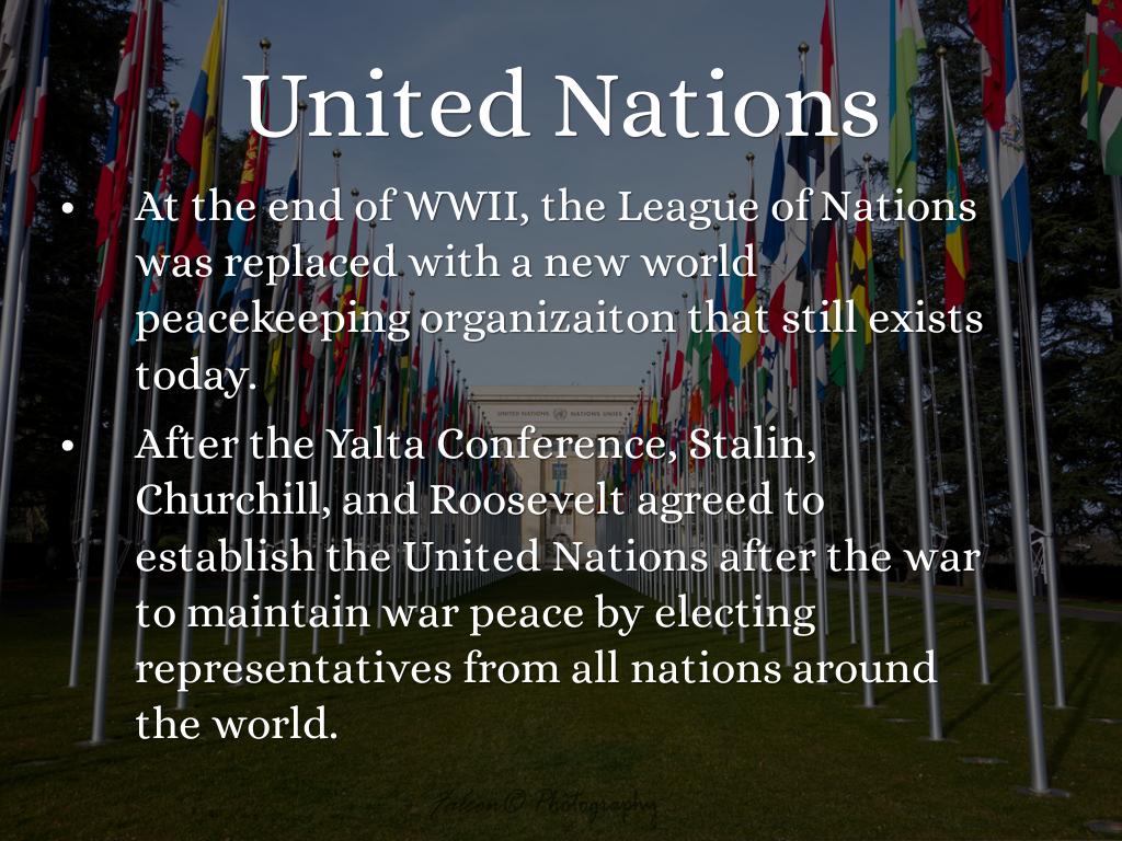 After the Yalta Conference, Stalin, Churchill, and Roosevelt agreed to establish the United Nations after the war to maintain war peace by electing representatives from all nations around the world.