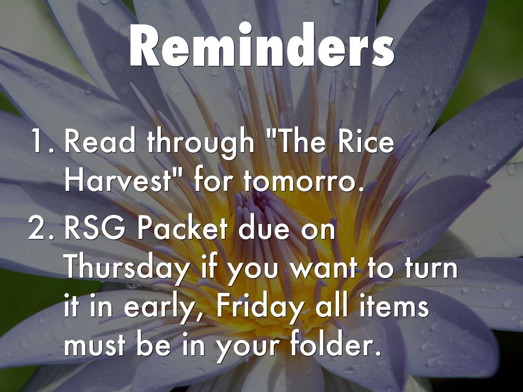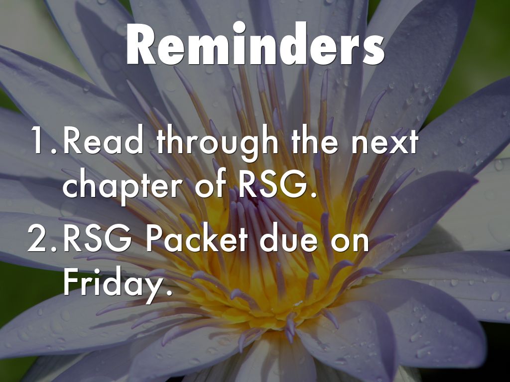 RSG Packet due on Thursday if you want to turn it in early, Friday all items must be in your folder.