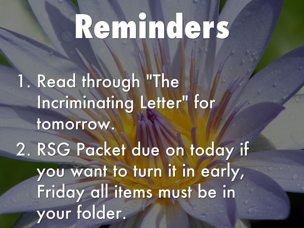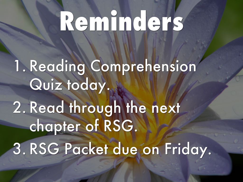 RSG Packet due on today if you want to turn it in early, Friday all items must be in your folder.
