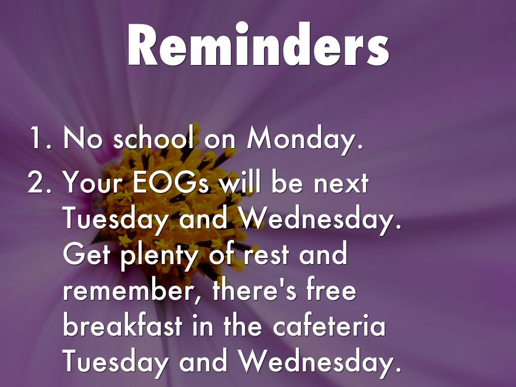 • Your EOGs will be next Tuesday and Wednesday. Get plenty of rest and remember, there's free breakfast in the cafeteria Tuesday and Wednesday.