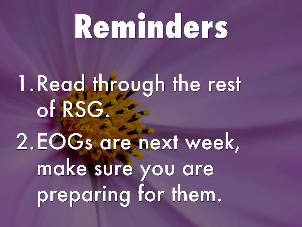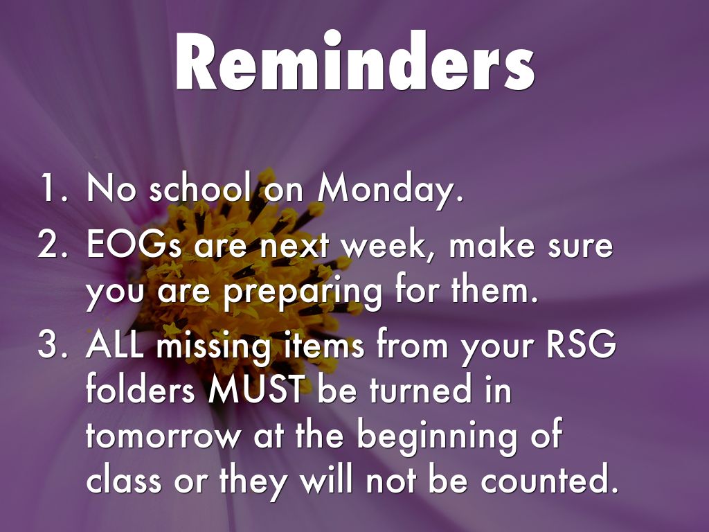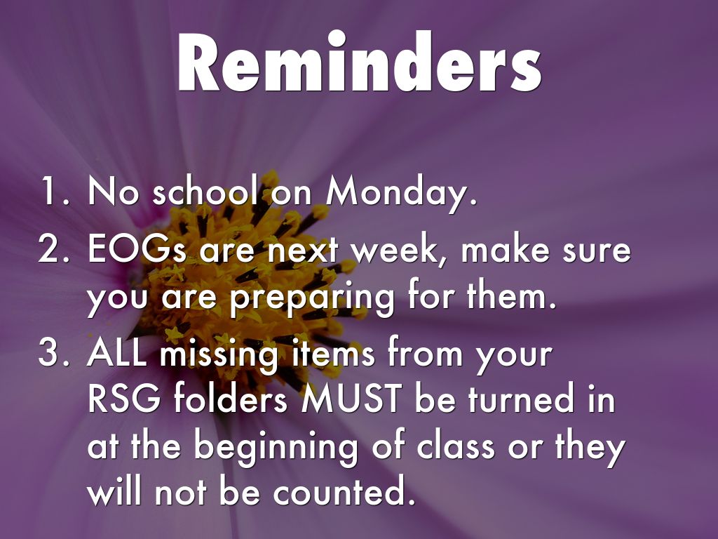 • ALL missing items from your RSG folders MUST be turned in tomorrow at the beginning of class or they will not be counted.