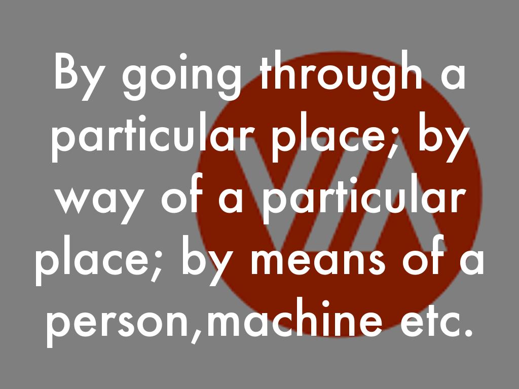 By going through a particular place; by way of a particular place; by means of a person,machine etc.