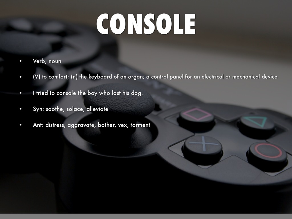 (V) to comfort; (n) the keyboard of an organ; a control panel for an electrical or mechanical device