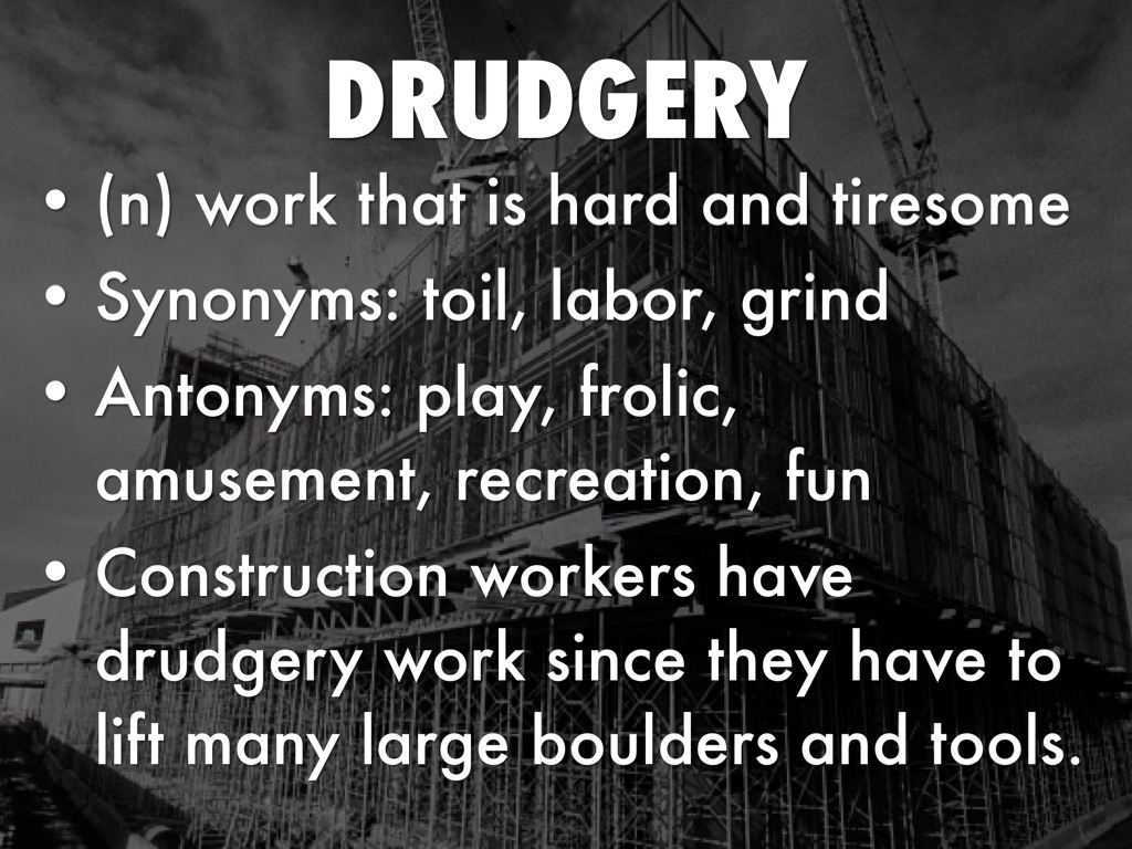 Construction workers have drudgery work since they have to lift many large boulders and tools.