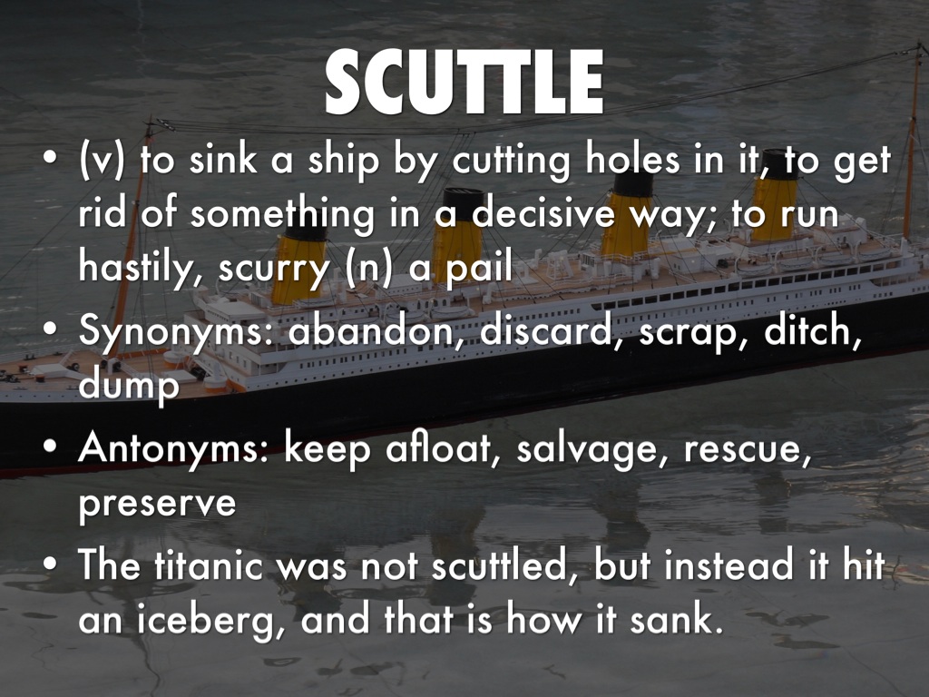 The titanic was not scuttled, but instead it hit an iceberg, and that is how it sank.