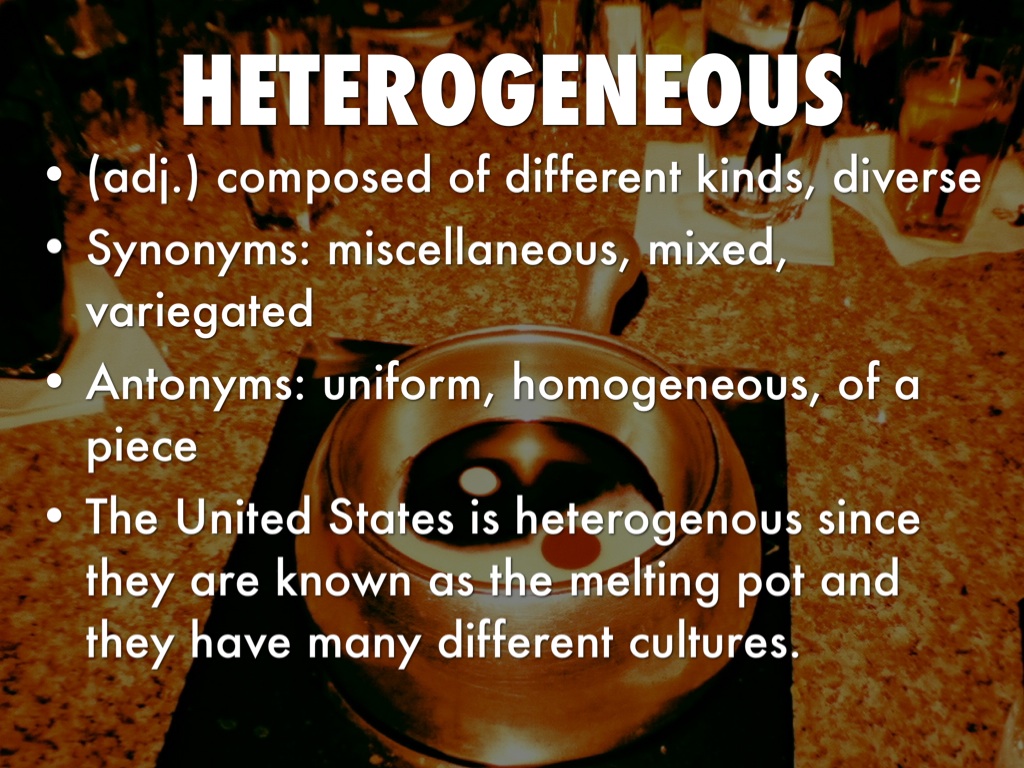 The United States is heterogenous since they are known as the melting pot and they have many different cultures.