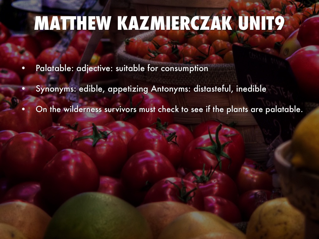 Synonyms: edible, appetizing Antonyms: distasteful, inedible