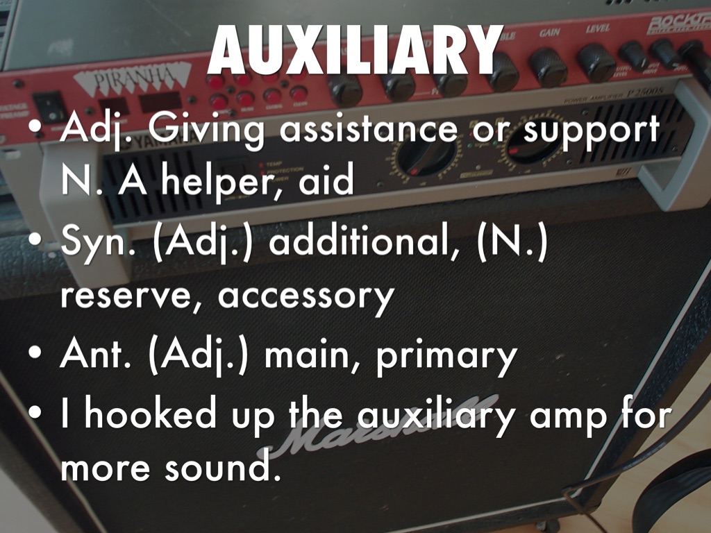 Syn. (Adj.) additional, (N.) reserve, accessory