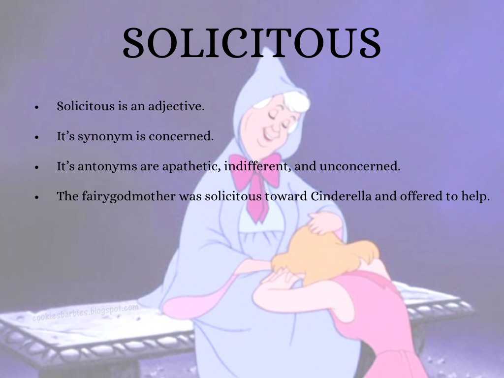 The fairygodmother was solicitous toward Cinderella and offered to help.