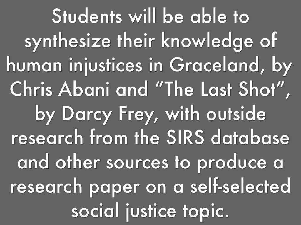 Students will be able to synthesize their knowledge of human injustices in Graceland, by Chris Abani and “The Last Shot”, by Darcy Frey, with outside research from the SIRS database and other sources to produce a research paper on a self-selected social justice topic.