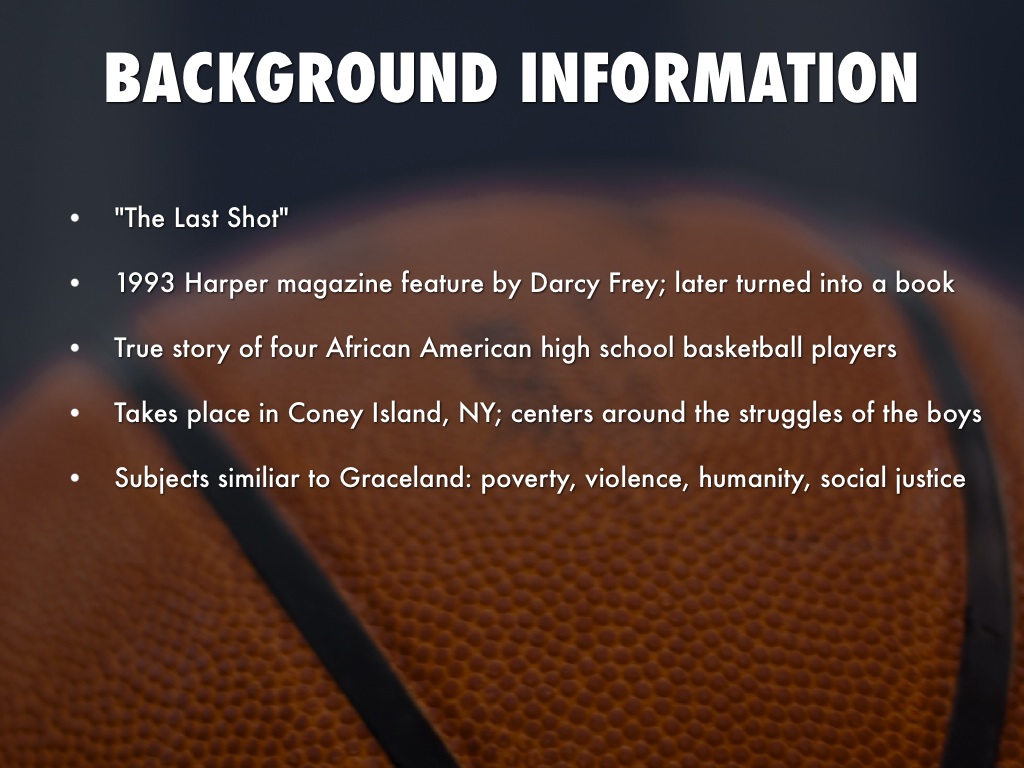 Students will be able to compare examples of the social injustice and humanity experienced by the character Elvis in Graceland, by Chris Abani, and Russell, Stephon and Corey in “The Last Shot”, by Darcy Frey.