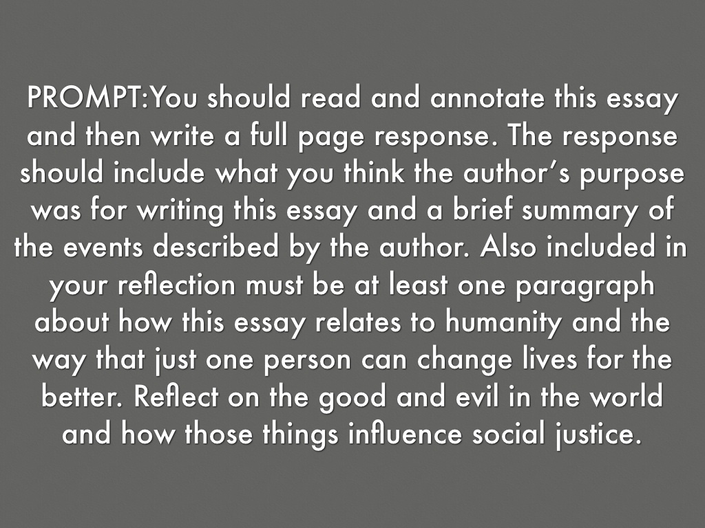 PROMPT:You should read and annotate this essay and then write a full page response. The response should include what you think the author’s purpose was for writing this essay and a brief summary of the events described by the author. Also included in your reflection must be at least one paragraph about how this essay relates to humanity and the way that just one person can change lives for the better. Reflect on the good and evil in the world and how those things influence social justice.
