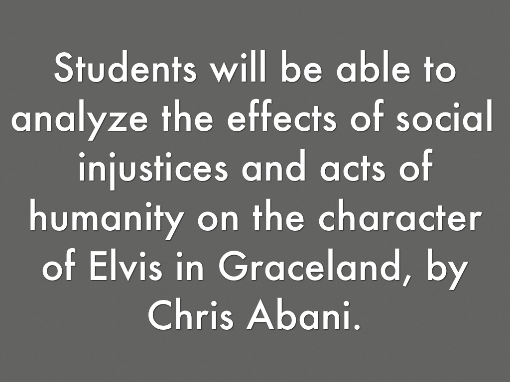 Students will be able to analyze the effects of social injustices and acts of humanity on the character of Elvis in Graceland, by Chris Abani.