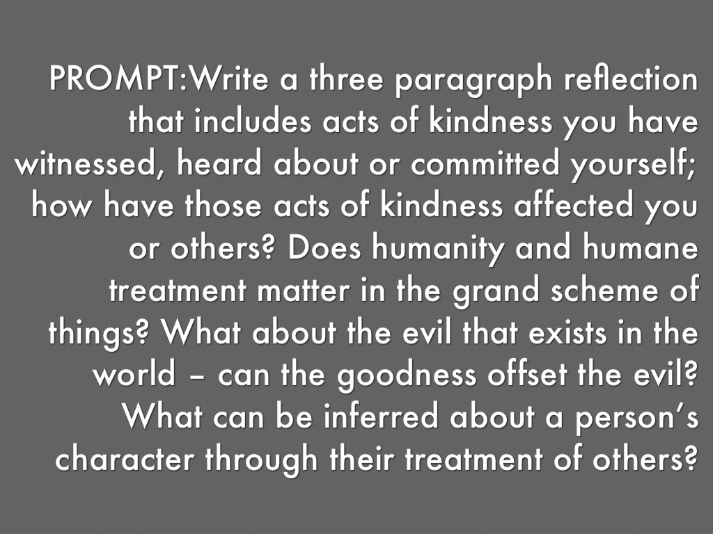 PROMPT:Write a three paragraph reflection that includes acts of kindness you have witnessed, heard about or committed yourself; how have those acts of kindness affected you or others? Does humanity and humane treatment matter in the grand scheme of things? What about the evil that exists in the world – can the goodness offset the evil? What can be inferred about a person’s character through their treatment of others?