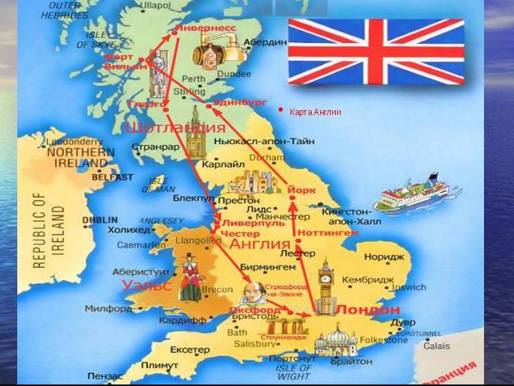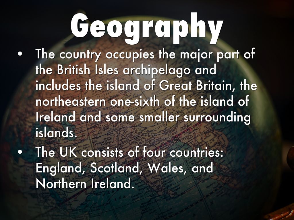 The country occupies the major part of the British Isles archipelago and includes the island of Great Britain, the northeastern one-sixth of the island of Ireland and some smaller surrounding islands.