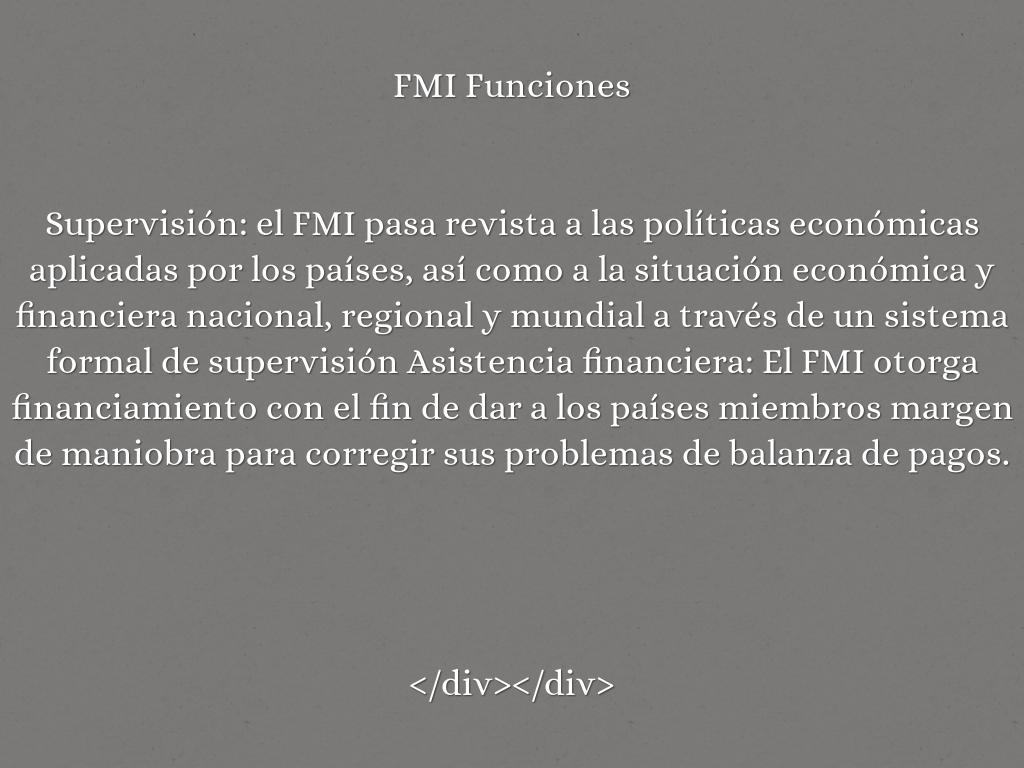 Supervisión: el FMI pasa revista a las políticas económicas aplicadas por los países, así como a la situación económica y financiera nacional, regional y mundial a través de un sistema formal de supervisión Asistencia financiera: El FMI otorga financiamiento con el fin de dar a los países miembros margen de maniobra para corregir sus problemas de balanza de pagos.