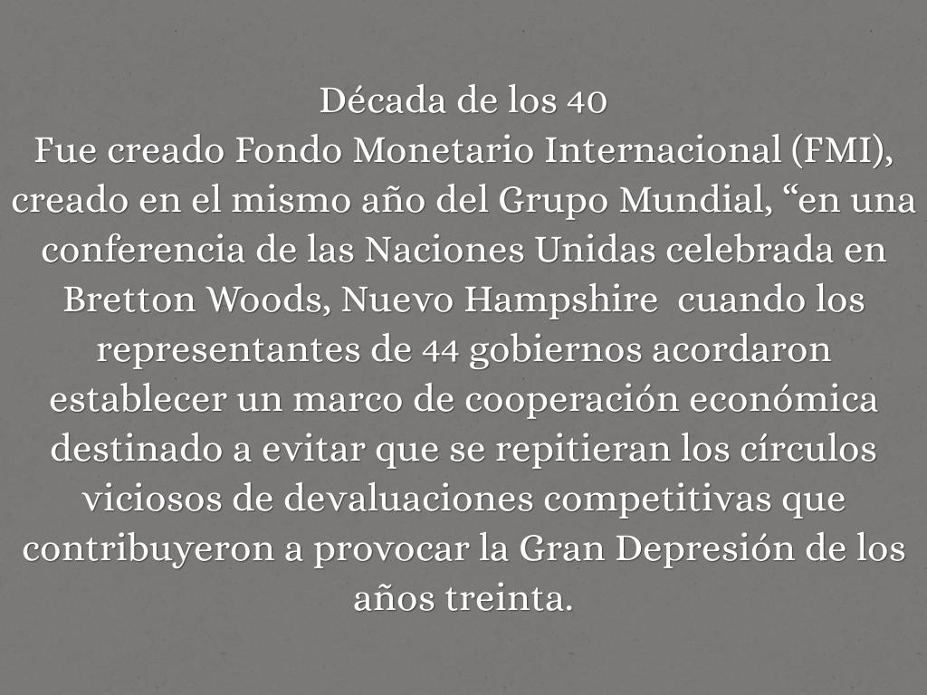 Fue creado Fondo Monetario Internacional (FMI), creado en el mismo año del Grupo Mundial, “en una conferencia de las Naciones Unidas celebrada en Bretton Woods, Nuevo Hampshire cuando los representantes de 44 gobiernos acordaron establecer un marco de cooperación económica destinado a evitar que se repitieran los círculos viciosos de devaluaciones competitivas que contribuyeron a provocar la Gran Depresión de los años treinta.