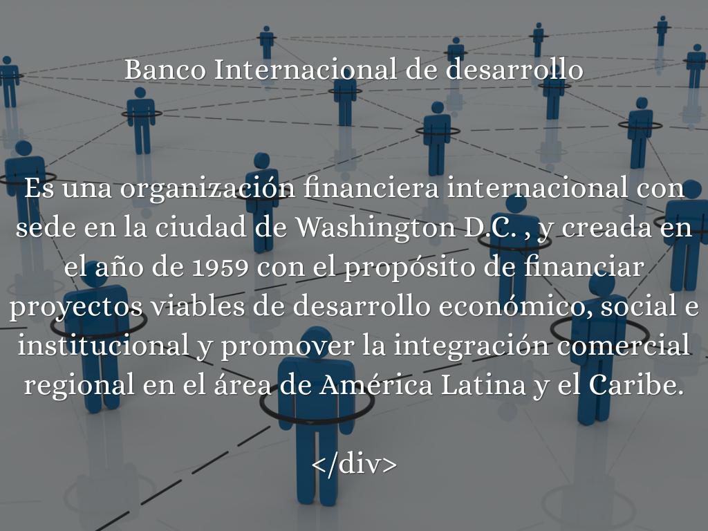 Es una organización financiera internacional con sede en la ciudad de Washington D.C. , y creada en el año de 1959 con el propósito de financiar proyectos viables de desarrollo económico, social e institucional y promover la integración comercial regional en el área de América Latina y el Caribe.
