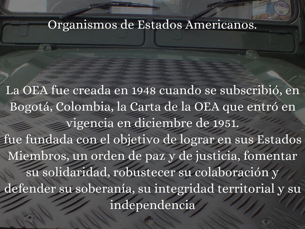 La OEA fue creada en 1948 cuando se subscribió, en Bogotá, Colombia, la Carta de la OEA que entró en vigencia en diciembre de 1951.