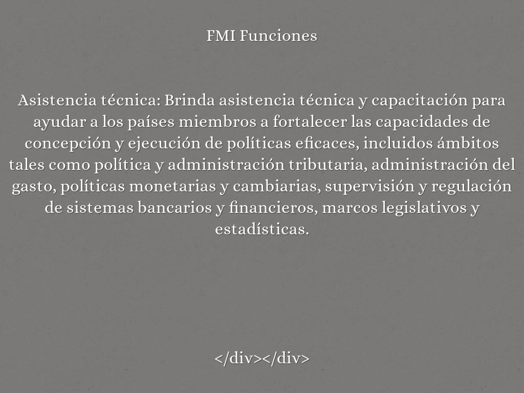 Asistencia técnica: Brinda asistencia técnica y capacitación para ayudar a los países miembros a fortalecer las capacidades de concepción y ejecución de políticas eficaces, incluidos ámbitos tales como política y administración tributaria, administración del gasto, políticas monetarias y cambiarias, supervisión y regulación de sistemas bancarios y financieros, marcos legislativos y estadísticas.