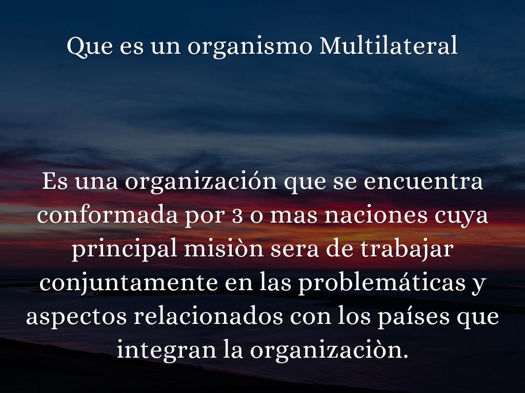 Es una organización que se encuentra conformada por 3 o mas naciones cuya principal misiòn sera de trabajar conjuntamente en las problemáticas y aspectos relacionados con los países que integran la organizaciòn.
