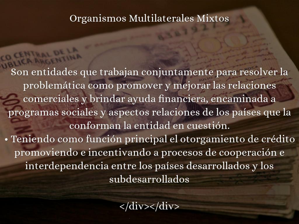 Son entidades que trabajan conjuntamente para resolver la problemática como promover y mejorar las relaciones comerciales y brindar ayuda financiera, encaminada a programas sociales y aspectos relaciones de los países que la conforman la entidad en cuestión.