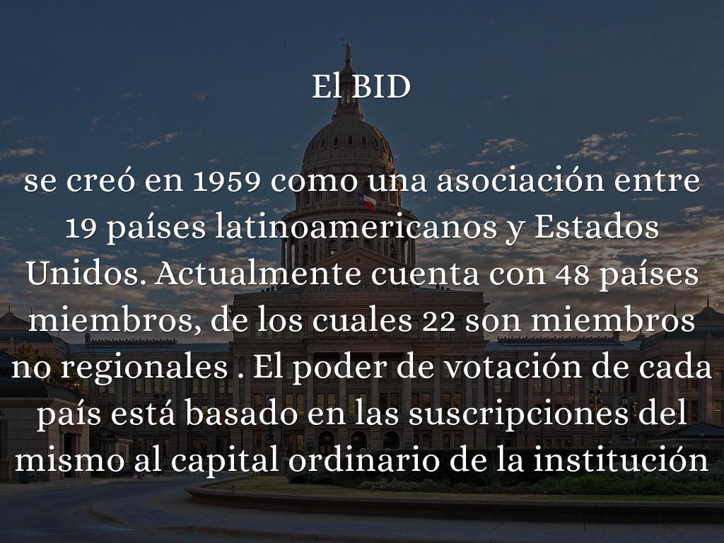 se creó en 1959 como una asociación entre 19 países latinoamericanos y Estados Unidos. Actualmente cuenta con 48 países miembros, de los cuales 22 son miembros no regionales . El poder de votación de cada país está basado en las suscripciones del mismo al capital ordinario de la institución