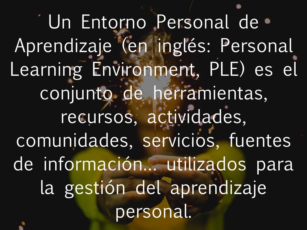 Un Entorno Personal de Aprendizaje (en inglés: Personal Learning Environment, PLE) es el conjunto de herramientas, recursos, actividades, comunidades, servicios, fuentes de información… utilizados para la gestión del aprendizaje personal.