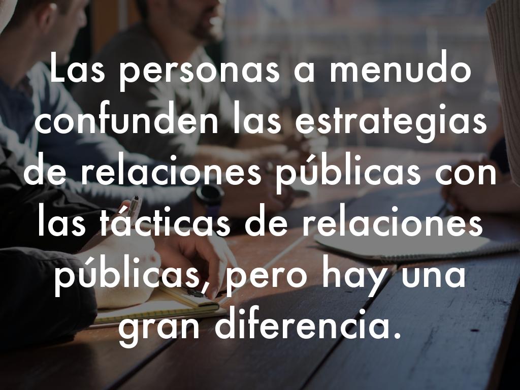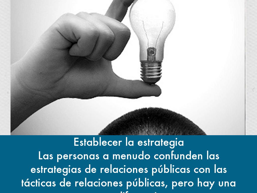 Establecer la estrategia Las personas a menudo confunden las estrategias de relaciones públicas con las tácticas de relaciones públicas, pero hay una gran diferencia.