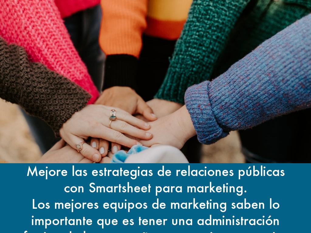 Mejore las estrategias de relaciones públicas con Smartsheet para marketing. Los mejores equipos de marketing saben lo importante que es tener una administración efectiva de las campañas, operaciones creativas consistentes y una logística de los eventos confiable. Smartsheet lo ayuda a ser exitoso en los tres frentes, para que sea más eficiente y que logre más.