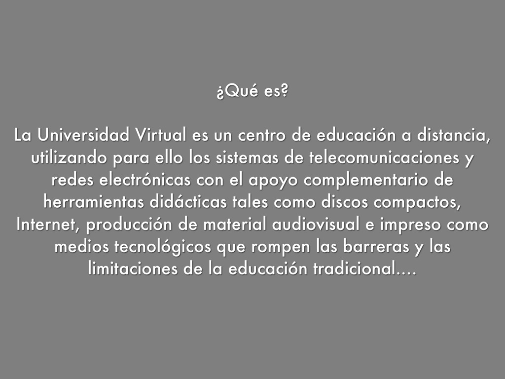 La Universidad Virtual es un centro de educación a distancia, utilizando para ello los sistemas de telecomunicaciones y redes electrónicas con el apoyo complementario de herramientas didácticas tales como discos compactos, Internet, producción de material audiovisual e impreso como medios tecnológicos que rompen las barreras y las limitaciones de la educación tradicional.