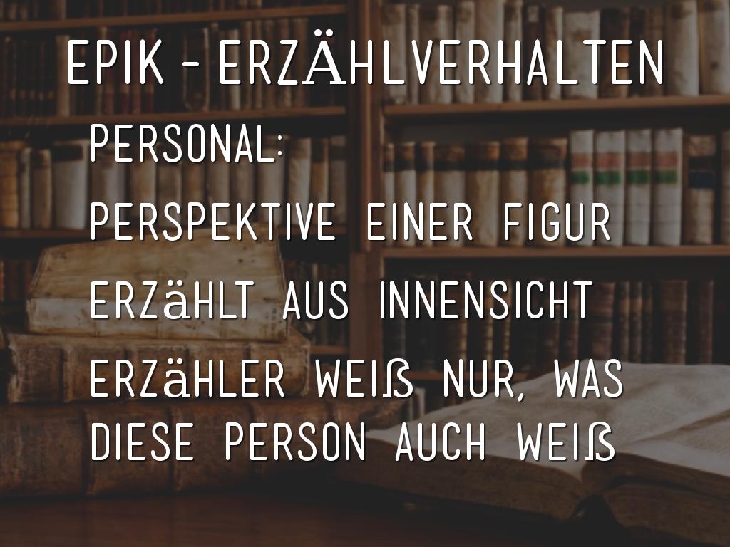 - Nähe: Erzähler im Geschehen, geringer Überblick aber detaillierter