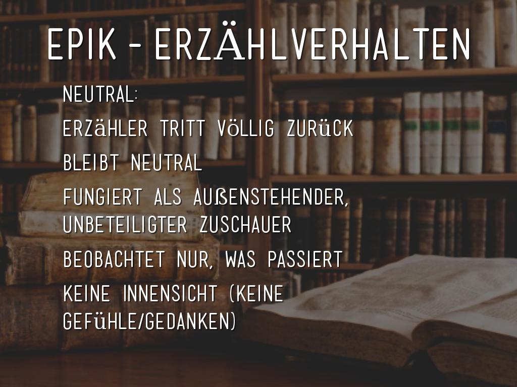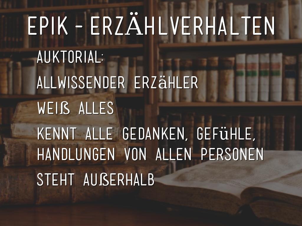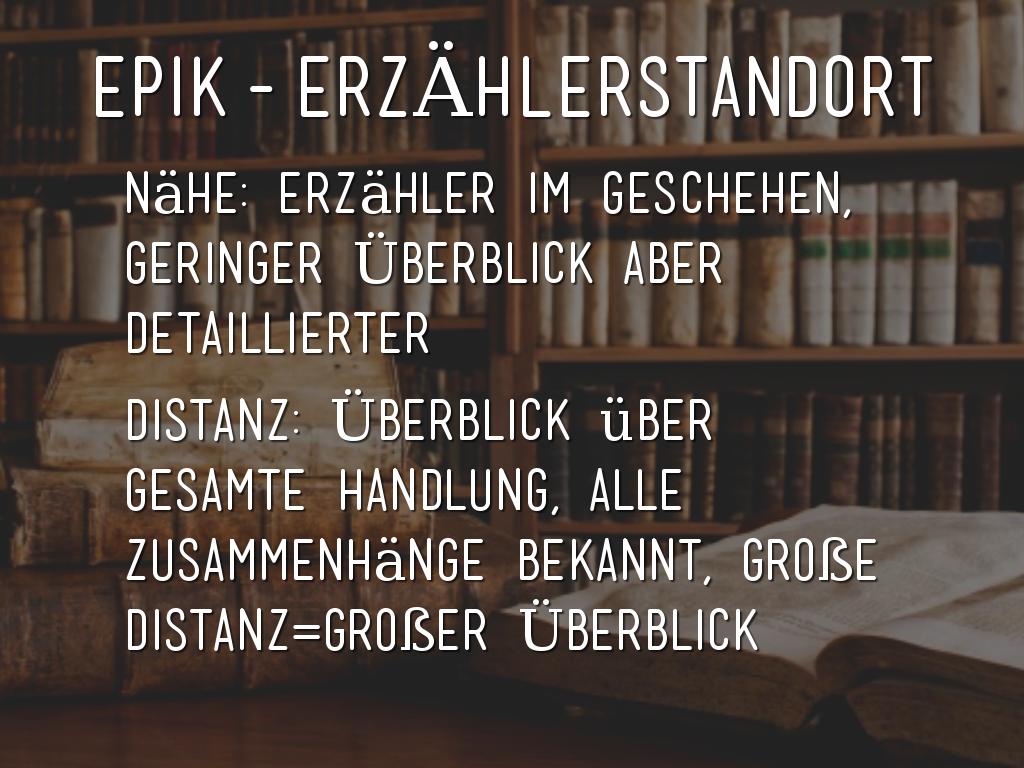 - Distanz: Überblick über gesamte Handlung, alle Zusammenhänge bekannt, große Distanz=großer Überblick