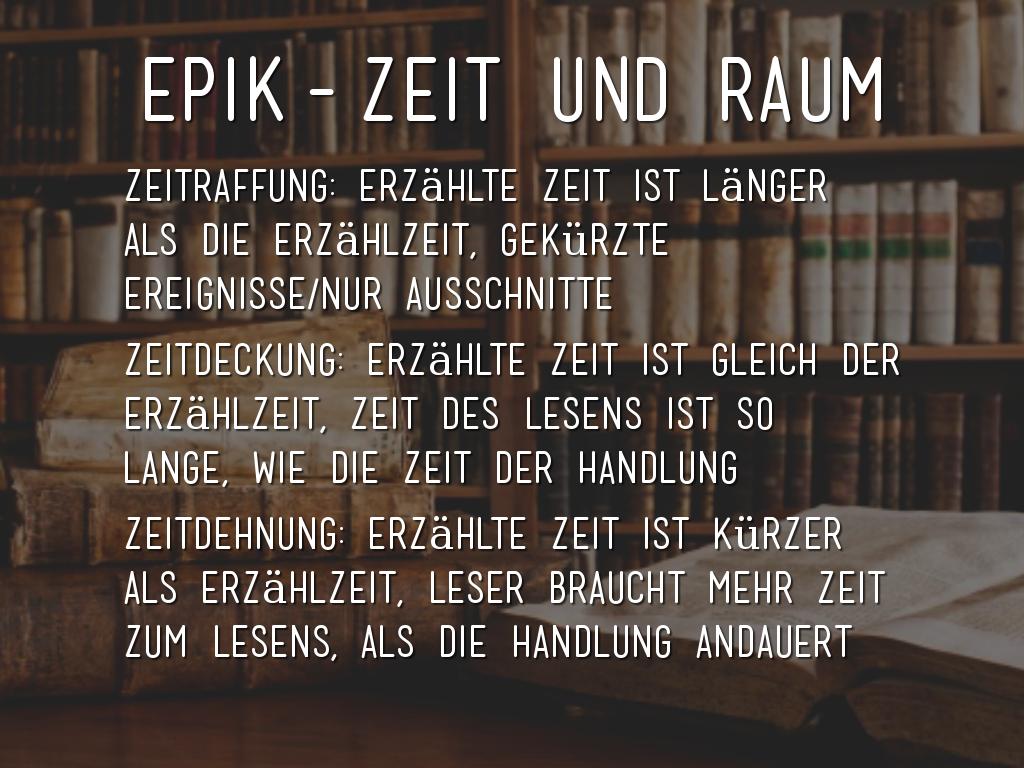 - Zeitdehnung: Erzählte Zeit ist kürzer als Erzählzeit, Leser braucht mehr Zeit zum Lesens, als die Handlung andauert