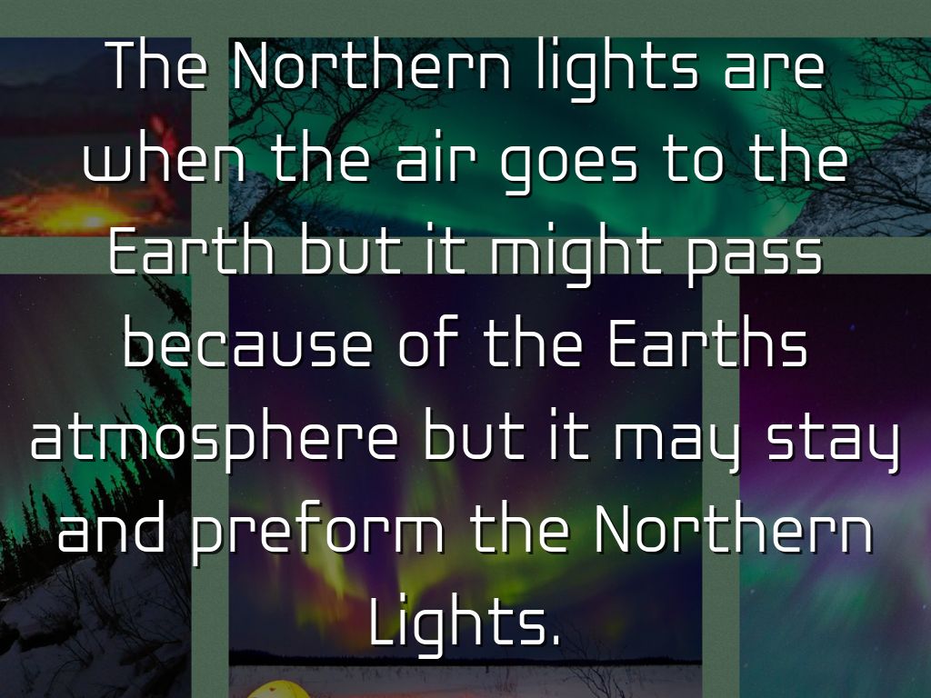 The Northern lights are when the air goes to the Earth but it might pass because of the Earths atmosphere but it may stay and preform the Northern Lights.