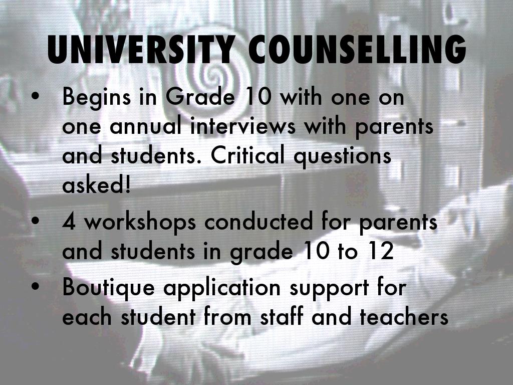 Begins in Grade 10 with one on one annual interviews with parents and students. Critical questions asked!