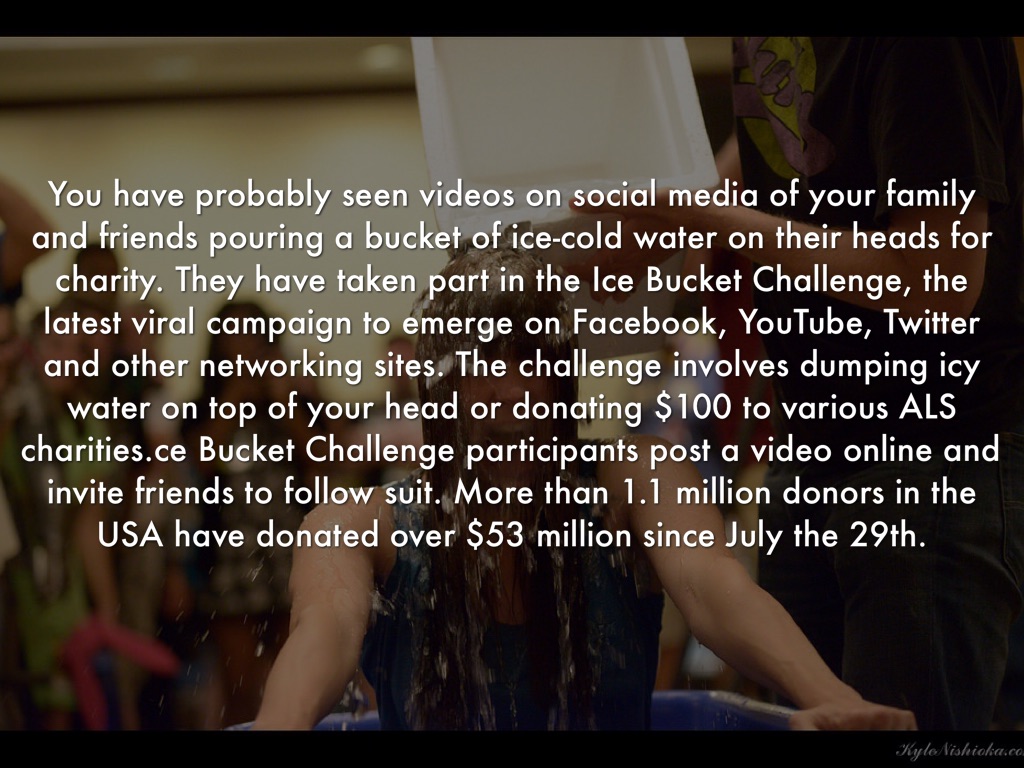You have probably seen videos on social media of your family and friends pouring a bucket of ice-cold water on their heads for charity. They have taken part in the Ice Bucket Challenge, the latest viral campaign to emerge on Facebook, YouTube, Twitter and other networking sites. The challenge involves dumping icy water on top of your head or donating $100 to various ALS charities.ce Bucket Challenge participants post a video online and invite friends to follow suit. More than 1.1 million donors in the USA have donated over $53 million since July the 29th.