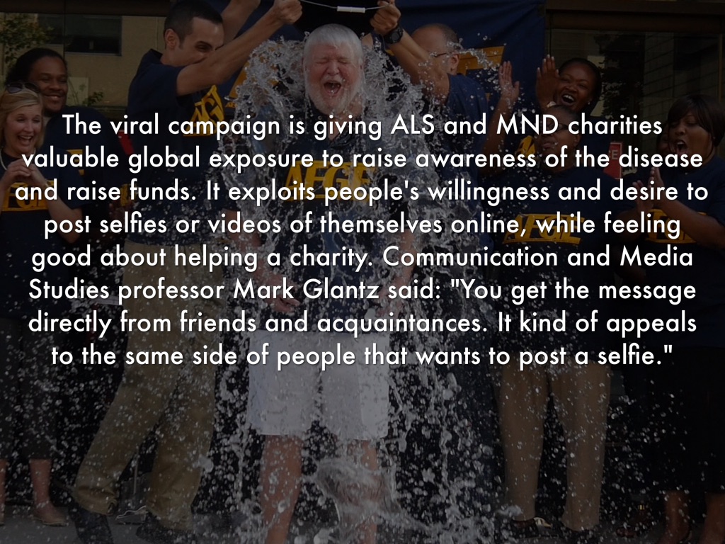 The viral campaign is giving ALS and MND charities valuable global exposure to raise awareness of the disease and raise funds. It exploits people's willingness and desire to post selfies or videos of themselves online, while feeling good about helping a charity. Communication and Media Studies professor Mark Glantz said: "You get the message directly from friends and acquaintances. It kind of appeals to the same side of people that wants to post a selfie."