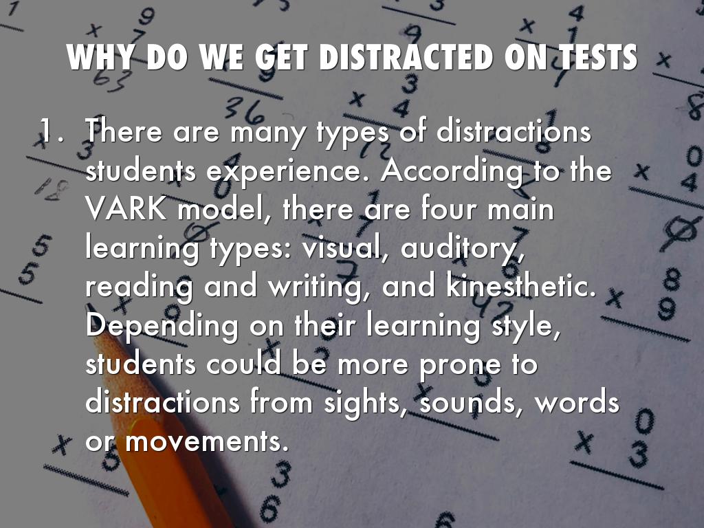 There are many types of distractions students experience. According to the VARK model, there are four main learning types: visual, auditory, reading and writing, and kinesthetic. Depending on their learning style, students could be more prone to distractions from sights, sounds, words or movements.