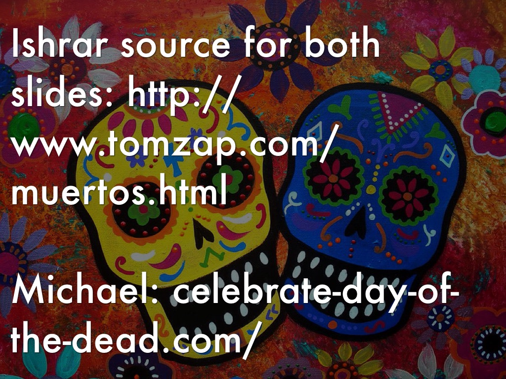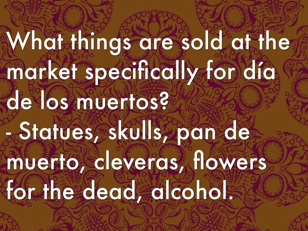 - Statues, skulls, pan de muerto, cleveras, flowers for the dead, alcohol.
