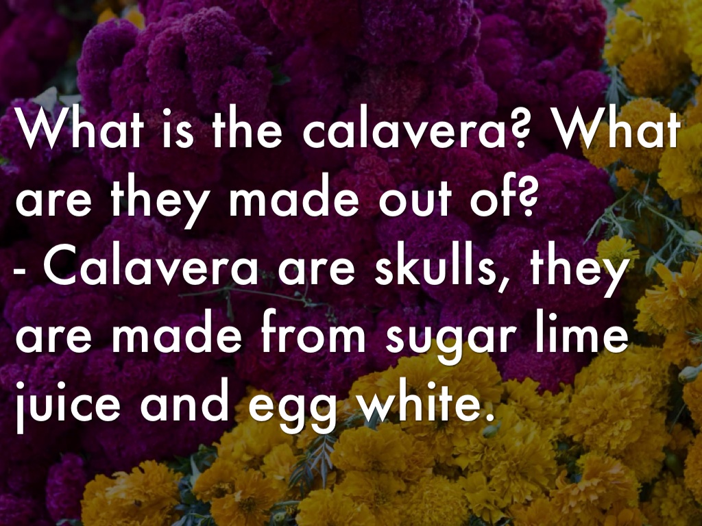 - Calavera are skulls, they are made from sugar lime juice and egg white.